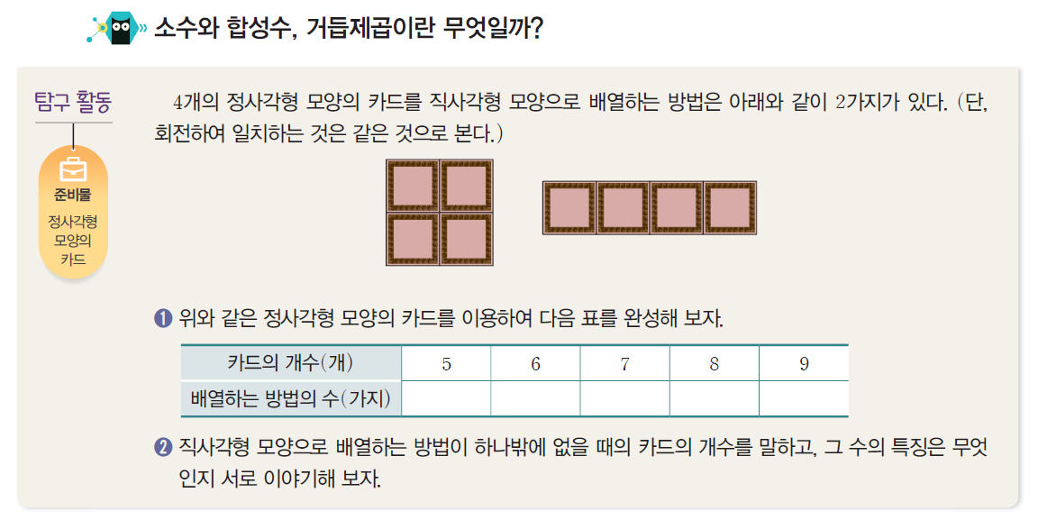 올해 제 수업에서 학생들은 실제로 카드를 만지고 조작하는 경험을 한 후, 모둠 발표를 준비하면서 활동과 그 의미에 대해 반성하는 기회를 가졌습니다. 학생들은 활동 아래쪽에 제시된 소수와 합성수에 관한 정보를 힌트로 하여, 5와 7은 약수가 1 그리고 자신뿐인 수들이라는 특징을 공통되게 찾아냈습니다. 저는 이어서 카드를 직사각형 모양으로 놓는다는 것은 가로와 세로를 곱해 그 수가 되도록 만드는 것이며, 결국 가로와 세로 길이는 그 수의 약수라는 점을 지적해 약수에 관한 학생들의 이전 지식과 명시적으로 연결했습니다.