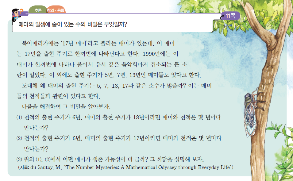 최소공배수 단원에서는 빠질 수 없는 실생활 소재가 주기성을 가지는 매미의 출현이죠. 미국을 비롯한 북미 지역에서는 주기성을 가지고 출현하는 매미들이 지역마다 수십억 단위로 출현해 화제가 되기도 하고 골치가 되기도 한답니다. 지난 2020년에는 조지아주를 비롯한 여러 곳에서 2003년 이후 17년만에 주기매미(periodical cicadas)의 대발생이 일어나 뉴스가 되었습니다. 이 외에도 5, 7, 13년의 주기를 가지는 여러 종류의 주기매미들이 있는데, 공통점은 소수(素數, prime number)라는 것이죠.