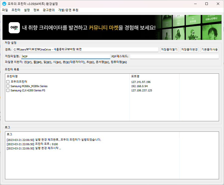 모두의 프린터 설치 완료 후 아래와 같이 '실행 환경 체크완료..모두의 프린터가 실행되었습니다.' 라는 메시지가 뜨면 준비 완료입니다. 저는 프린터 이름을 바꿨는데, 기본적으로는 CLX-6240, CLX-6200이라는 이름의 프린터가 생길 겁니다. 이제 ezpdf 리더에서 문서를 열고, 해당 프린터를 선택해서 인쇄하면 아래 그림에 설정된 폴더에 MOP.pdf라는 형태로 인쇄가 됩니다.
