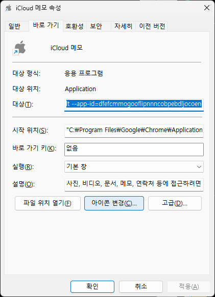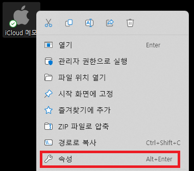 바탕화면에 생긴 iCloud 메모 아이콘을 오른쪽으로 클릭하고 속성을 누릅니다.