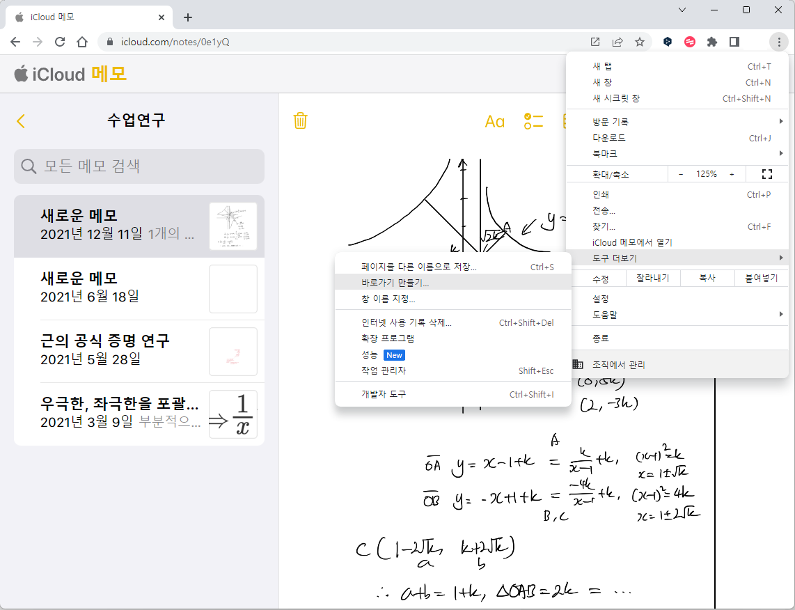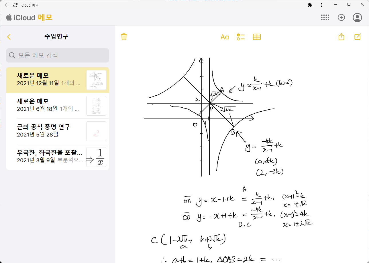 바탕화면에 iCloud 메모 아이콘이 생깁니다. 이제부터 이 아이콘을 실행하면 아래와 같이 iCloud 메모를 마치 윈도우 네이티브 앱처럼 접근하고 사용할 수 있습니다. 유튜브 뮤직 앱 등과 유사한 형식입니다. 텍스트 메모 및 짧은 필기 메모를 보거나 작성하는 것에 큰 제약이 없으며, 비록 크롬 웹뷰 환경이므로 컨텍스트 메뉴는 사용할 수 없지만 그런대로 제 기능을 합니다.