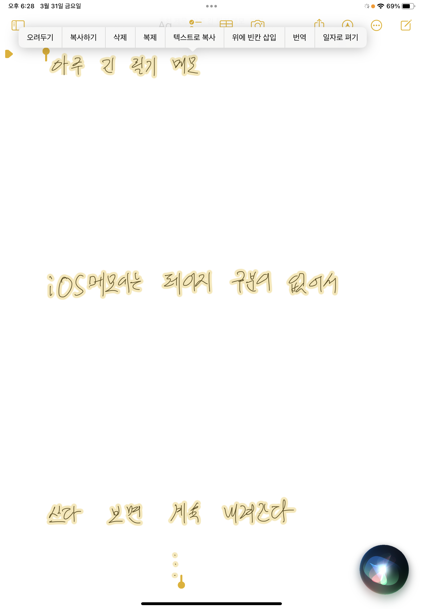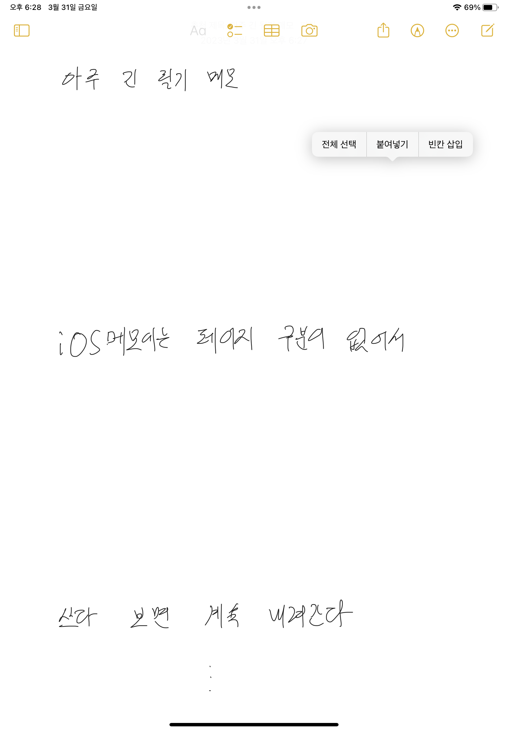 메모 앱의 긴 필기 메모에서 빈 영역을 길게 눌러 뜨는 메뉴에서 전체 선택을 누릅니다.