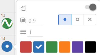 3. 점 크기 및 불투명도: 동일한 메뉴 위쪽에서 점 크기(초기 9)를 1로 줄이면 거의 안 보이게 되며, 투명도를 바꿔도 됩니다. 투명도는 1이면 완전 불투명, 0이면 완전 투명(안 보임)입니다. 점만이 아니라 글씨도 같이 투명해지는 점에 주의해야 합니다. 드래그 가능한 점일 때는 투명도 옵션만 설정 가능합니다.