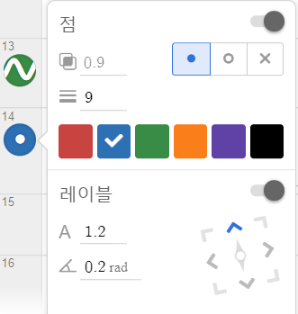 1. 배치 및 회전: 대수창에서 점 아이콘을 오랫동안 클릭하면 메뉴가 나옵니다. '레이블' 부분에서 파랗게 표시된 곳은 점을 기준으로 레이블이 표시되는 위치를 말하며, 레이블의 글자 크기(배율)와 회전각(라디안)을 소수 단위까지 지정할 수 있습니다. 저처럼 설정하시면 120% 글자 크기, 0.2라디안(약 11.45도) 회전, 점을 기준으로 위쪽 가운데 정렬이 됩니다.