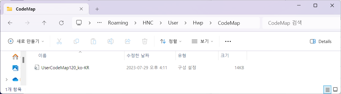 2. Roaming\HNC\User\Hwp\CodeMap폴더를 찾아 들어갑니다. 해당 폴더에 이미 있는 파일 이름을 확인합니다. 한글 2020의 경우 UserCodeMap110_ko-KR입니다.
