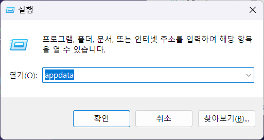 1. 윈도우키+R을 눌러 실행창을 켜고 appdata를 입력 후 확인을 누릅니다.