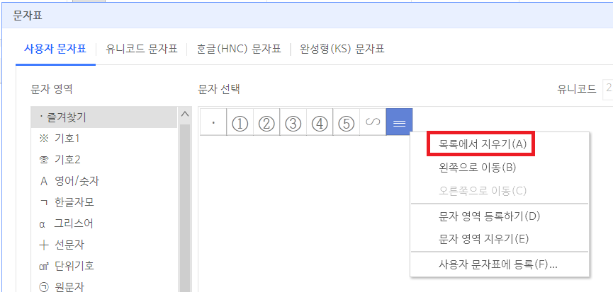 7. 다시 '사용자 문자표' 탭에서 '즐겨찾기'를 누르면 등록한 문자가 추가되어 있습니다. 삭제하려면 역시 오른쪽으로 클릭하여 '목록에서 지우기'를 누릅니다. 왼쪽으로 이동 또는 오른쪽으로 이동을 눌러 순서도 조정할 수 있습니다. 단, 'ㅁ누자 영역 지우기'를 눌러 버리면 즐겨찾기가 삭제되어 버리니 주의하시기 바랍니다.