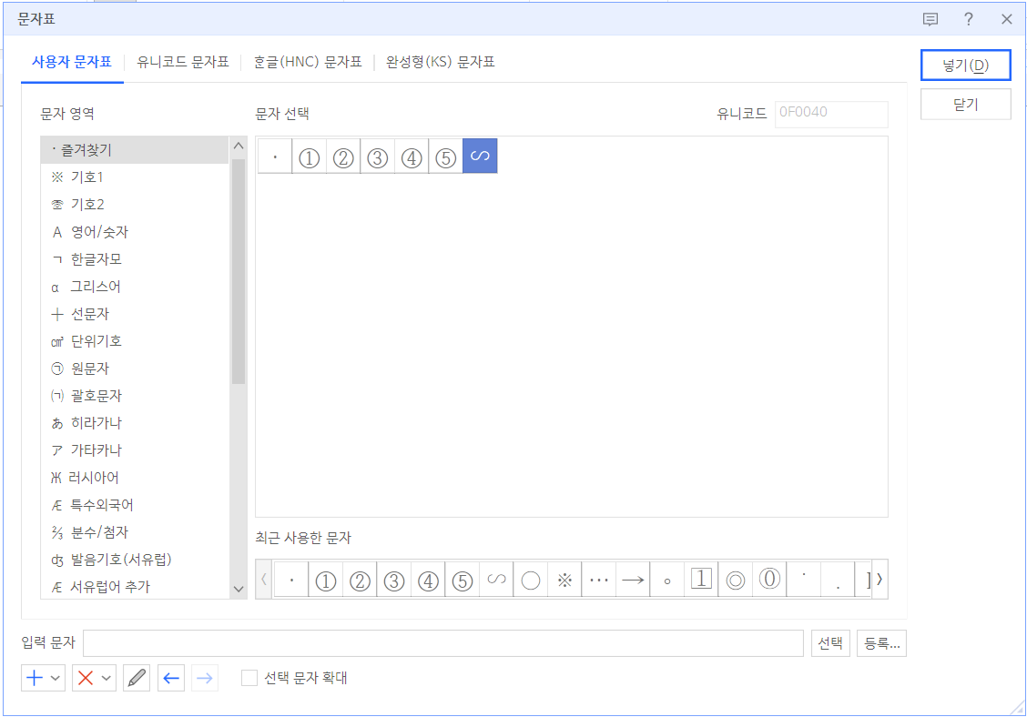 4. 한글을 켜고 Ctrl+F10을 눌러 문자표를 켭니다. 필요한 경우 상단에서 '사용자 문자표' 탭으로 이동합니다. 맨 위에 즐겨찾기 영역이 새로 등록된 것을 확인할 수 있습니다.