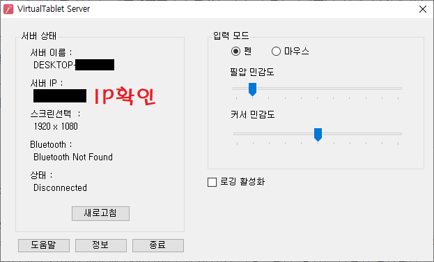- PC에서 VirtualTablet Server를 실행하고, 그림에서와 같이 PC의 IP 주소를 확인합니다.