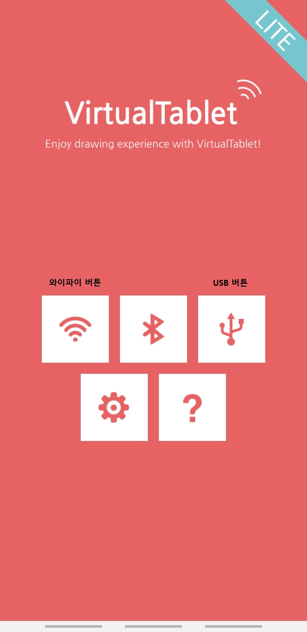 - 모바일에서 Virtual Tablet 앱을 실행하고 USB모양 버튼(첫 줄 세 번째)을 터치합니다.